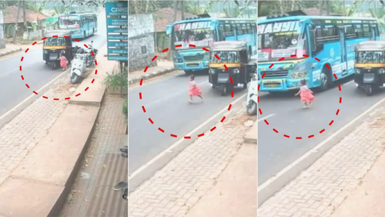 കോഴിക്കോട്: ബസ് അപകടത്തിൽ നിന്ന് കുഞ്ഞ് അത്ഭുതകരമായി രക്ഷപ്പെടുന്നതിന്റെ ഞെട്ടിപ്പിക്കുന്ന സിസിടിവി ദൃശ്യങ്ങൾ പുറത്ത്. കോഴിക്കോട് കൊടിയത്തൂരിലാണ് റോഡ് മുറിച്ചു കടക്കുന്നതിനിടെ ബസ് അപകടത്തിൽ നിന്ന് കുഞ്ഞ് തലനാരിഴക്ക് രക്ഷപ്പെട്ട സംഭവം നടന്നത്. സ്വകാര്യ ബസ് ഡ്രൈവറുടെ സമയോചിതമായ ഇടപെടലാണ് കുഞ്ഞ് രക്ഷപ്പെടാൻ കാരണമായത്. കഴിഞ്ഞ ദിവസം കൊടിയത്തൂരിൽ നടന്ന സംഭവത്തിന്റെ ദൃശ്യങ്ങളാണ് ഇപ്പോൾ പുറത്തുവന്നത്. റോഡരികിൽ നിർത്തിയിട്ടിരിക്കുന്ന ഓട്ടോറിക്ഷയിൽ നിന്ന് ഇറങ്ങി റോഡിൻ്റെ മറുഭാഗത്തേക്ക് കുഞ്ഞ് ഓടിപോവുകയായിരുന്നു. ഇതിനിടയിലാണ് സ്വകാര്യ ബസ് വന്നത്.കുഞ്ഞിനെ കണ്ടതും ബസ് ഡ്രൈവർ ബസ് വലതുവശത്തേക്ക് അൽപ്പം മാറ്റി സഡൻ ബ്രേക്കിട്ട് നിർത്തുകയായിരുന്നു. ബസിൻ്റെ പിൻചക്രമുള്ള ഭാഗം കുഞ്ഞിനെ തൊട്ടുതൊട്ടില്ല എന്ന നിലയിലായിരുന്നു. ബസ് കണ്ടതും കുഞ്ഞ് ഉടനെ തിരിച്ച് ഓട്ടോ നിന്നിരുന്ന ഭാഗത്തേക്ക് ഓടിപ്പോവുകയായിരുന്നു. ഈ സംഭവത്തിൻ്റെ ദൃശ്യങ്ങളാണ് പുറത്തുവന്നത്. കുട്ടി മാതാപിതാക്കൾക്കൊപ്പം ഓട്ടോയിൽ വന്നിറങ്ങുകയായിരുന്നു. കുട്ടിയുടെ മാതാവ് ആദ്യം റോഡ് മുറിച്ച് കടന്നുപോയി. ഈ സമയം പിതാവ് ഓട്ടോയിലിരുന്ന് പണം നൽകുന്നതിനിടെ കുട്ടി അമ്മയുടെ അരികിലെത്താൻ റോഡ് മുറിച്ച് കടക്കാൻ ശ്രമിക്കുകയായിരുന്നുവെന്നും ഇതിനിടെയാണ് അപകടമുണ്ടായതെന്നുമാണ് വിവരം.