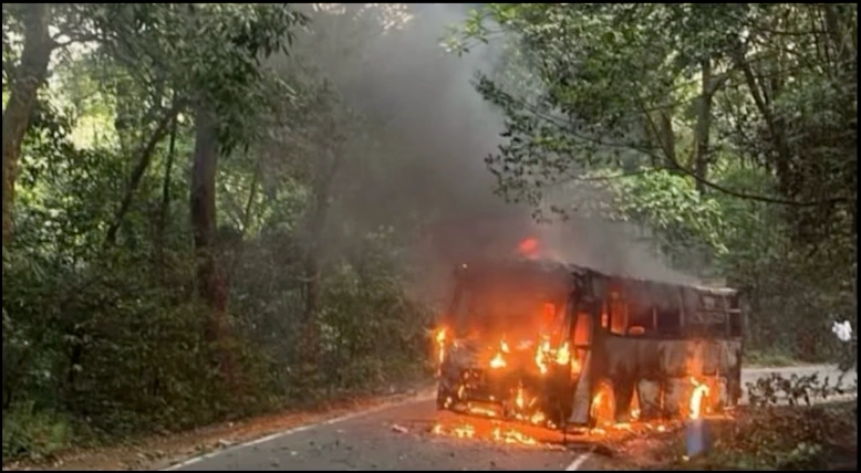 കണ്ണൂരിൽ ടൂറിസ്റ്റ് ബസിന് തീപിടിച്ചു, ബസ് പൂർണമായും കത്തിനശിച്ചു